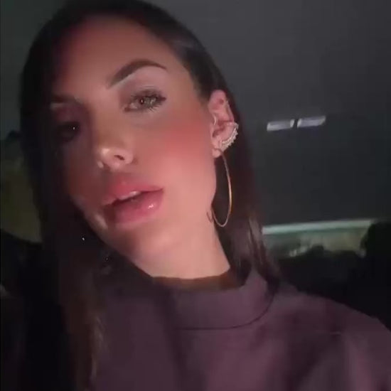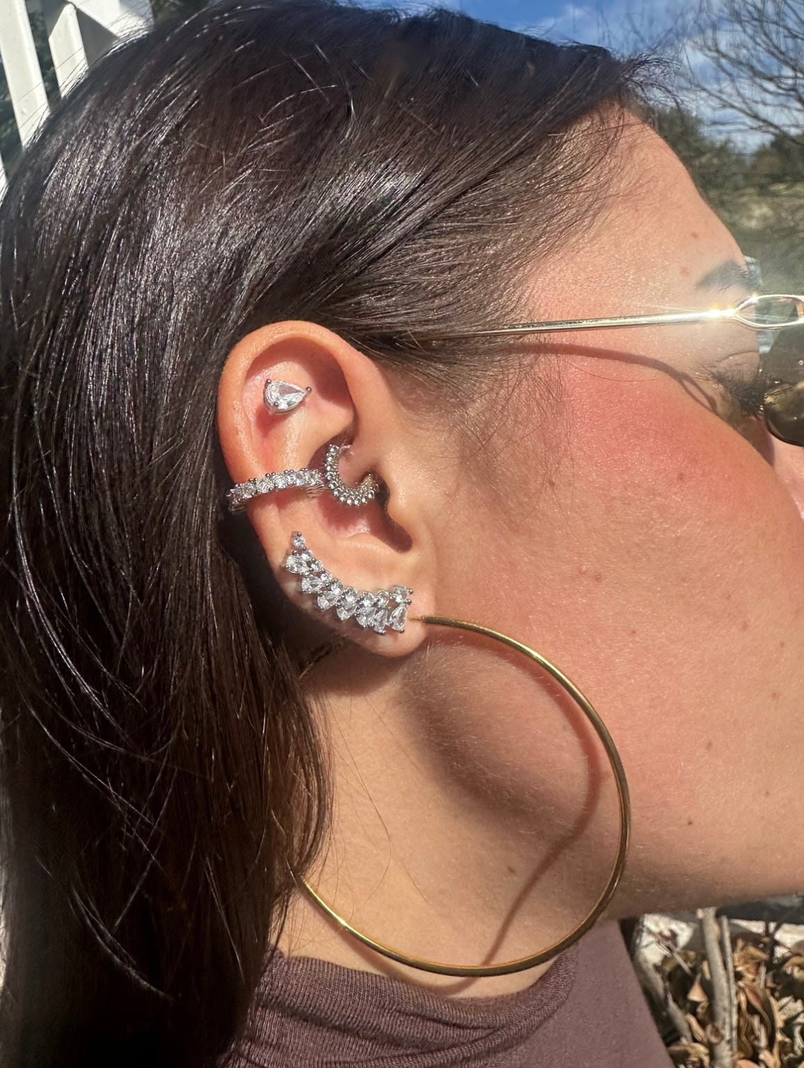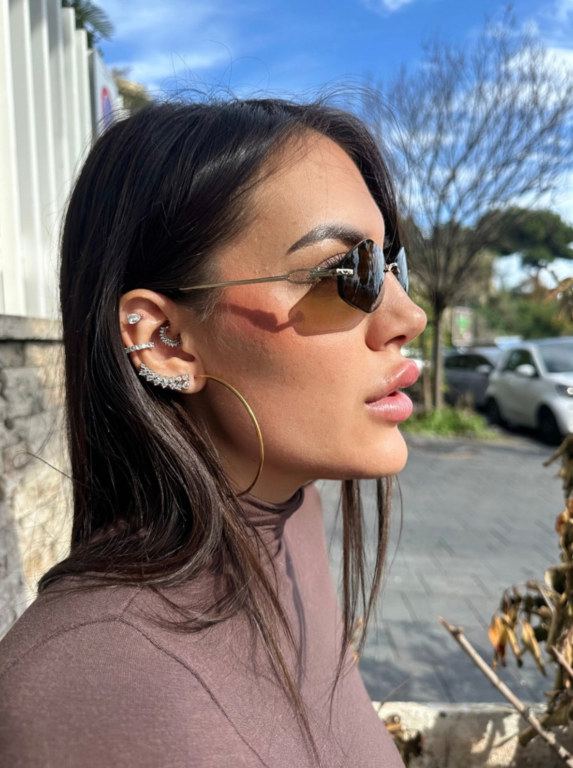 - Design: Un unico orecchino d’argento sottile e sinuoso che sale
