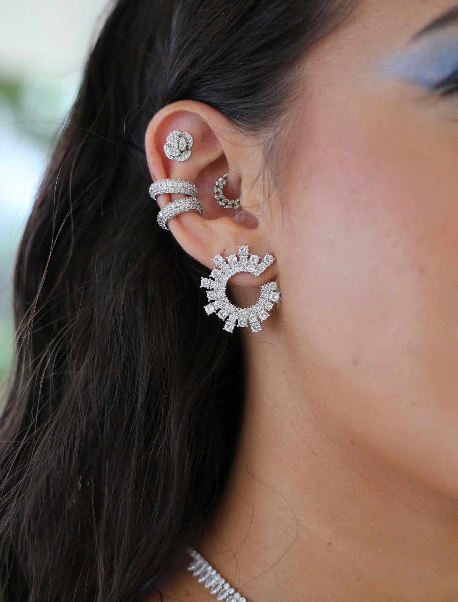 Il design a mezzo cerchio è impreziosito da una cascata di brillantini che catturano la luce con ogni movimento, regalando un effetto luminoso e magnetico.